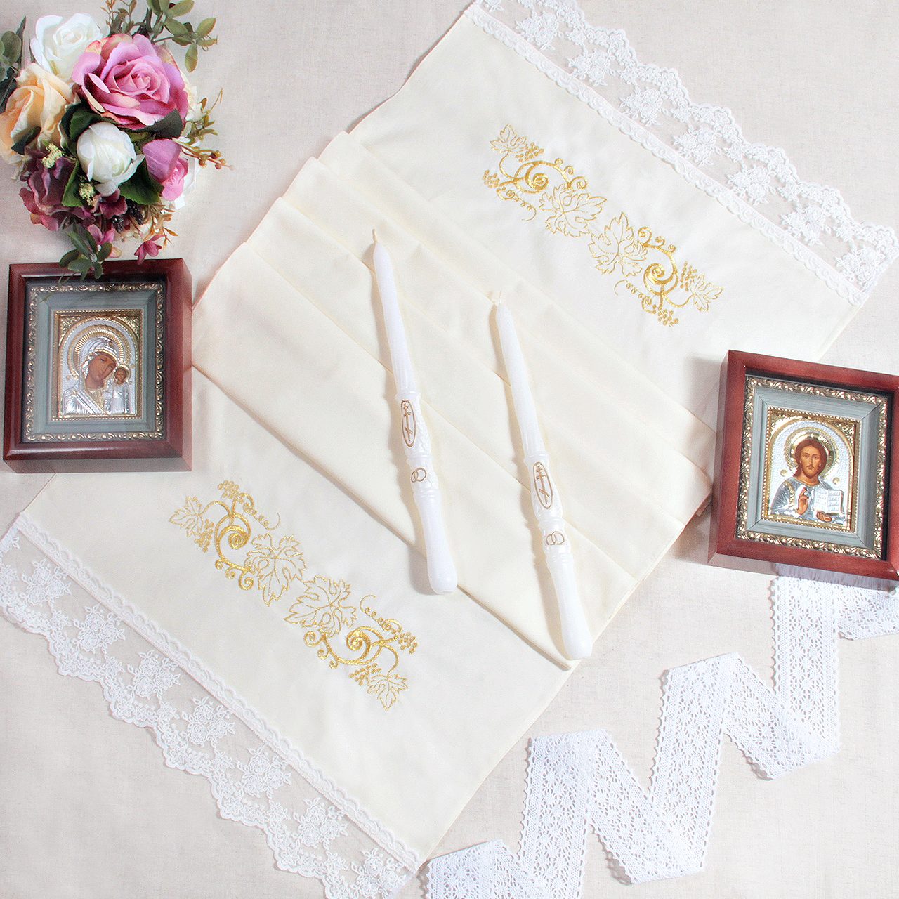 Die Kerzen werden während der Zeremonie von den Brautleuten in der linken Hand gehalten, damit sie sich mit der rechten bekreuzigen können. Die Form und Farbe der Kerzen spielen keine Rolle. Sie sollten jedoch nicht zu dünn sein, damit sie nicht während der Trauung abbrennen, aber auch nicht zu schwer, denn sie müssen über die gesamte Trauung hindurch in den Händen gehalten werden.